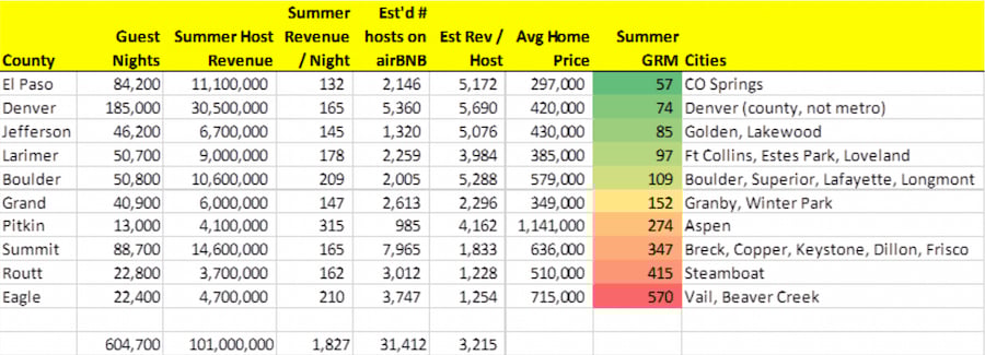 These calculations were made using regional home price divided by gross AirBnB summer revenue to create the GRM (Gross Rent Multiplier) for each area. Data points are from AirBnB, from 5.27.19 to 9.2.19.