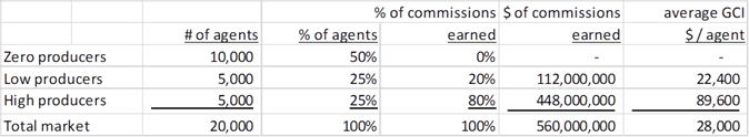 With 50,000 homes sold at $400,000 each (average of homes and condos – this is a simplification to make this easy to follow), there’s $20 billion of residential real estate sold. That generates around $560 million of GCI (gross commission income).