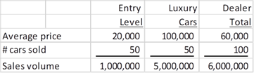Next year, the entry level car is 5% more expensive; the luxury car is 2% more expensive. But loan programs are not available for luxury cars. Everyone just buys an entry level car. You still sell 100 cars.