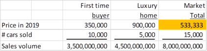 Imagine you own a car dealership, and you sell only entry level cars (FTB) for $20,000 and luxury cars for $100,000. You sell 50 of each. The average price is $60,000.