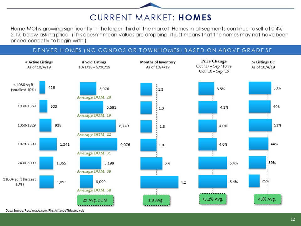 Although price appreciation has slowed slightly, the Denver-metro housing market, overall, remains strongly skewed toward sellers due to tight inventory and high buyer demand. The average days on market (DOM) is about 29 days, which is substantially lower than the 30+ year average of 70 DOM. Despite our continued seller’s market, buyers looking to trade up their smaller home for a larger home have found themselves with an excellent opportunity.