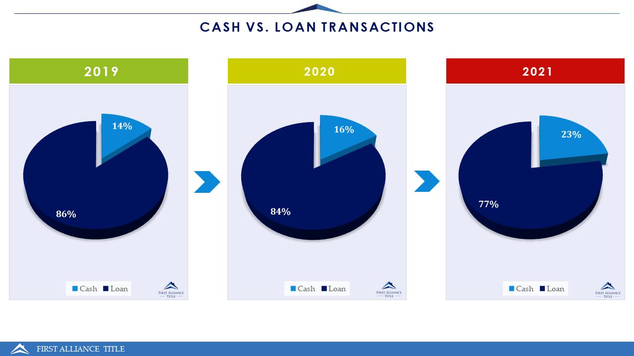 We recently pulled the historical data for closings at First Alliance Title to determine the cash purchases vs the financed purchases at our company. In 2019 only 14% of the buyers paid cash. Last year that percentage jumped to 23%. Quite a jump in two years.