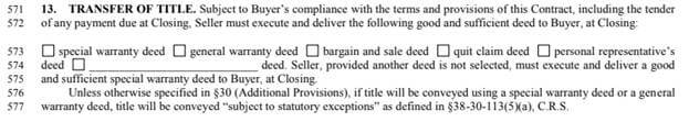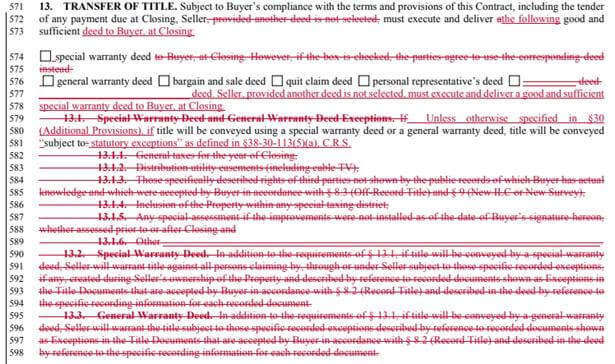 The only change to the purchase forms is Section 13, concerning how title will be conveyed. Below is a redline version alongside the new language. The real change has to do with the exceptions that are added to the different types of warranty deeds. The new law provides some clarity to a lot of questions and ambiguity about what exceptions should be included on the particular deed type. The new law defines the specific exceptions for each type of deed under the statute. Now, instead of listing lots of exceptions on the deed, the deeds will simply state that the conveyance is made “subject to statutory exceptions.”