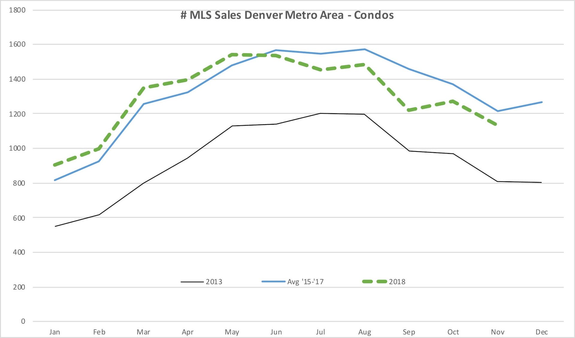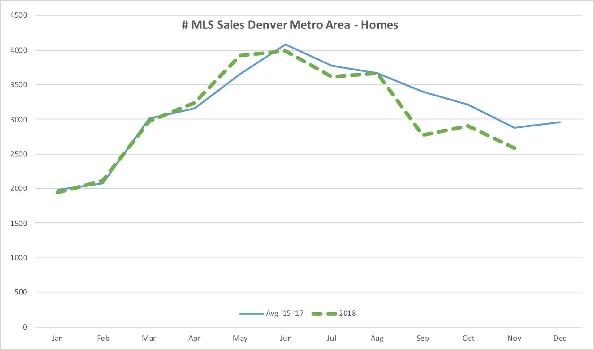 Below, the blue line is the number of closed homes each month. It’s the average of 2015, 2016 and 2017. The highest number of home sales is in the summer, and it’s slowest in January. The green dotted line is this year. You can see our sales volume in Jan – Aug ‘18 was about the same as the prior three years. The last three months have been less than recent historical.